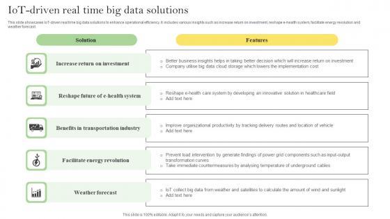 This slide showcases IoT-driven real time big data solutions to enhance operational efficiency. It includes various insights such as increase return on investment, reshape e-health system, facilitate energy revolution and weather forecast. Pitch your topic with ease and precision using this Iot Driven Real Time Big Data Solutions Ppt Infographic Template Show Pdf. This layout presents information on Health System, Facilitate Energy Revolution, Weather Forecast. It is also available for immediate download and adjustment. So, changes can be made in the color, design, graphics or any other component to create a unique layout. This slide showcases IoT-driven real time big data solutions to enhance operational efficiency. It includes various insights such as increase return on investment, reshape e-health system, facilitate energy revolution and weather forecast.