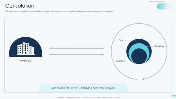 This slide provides a glimpse into solutions offered by the firm that solve industry problems. It includes solutions such as data, reporting, and analytics. Make sure to capture your audiences attention in your business displays with our gratis customizable Our Solution Big Data Analytics Investor Funding Elevator Pitch Deck. These are great for business strategies, office conferences, capital raising or task suggestions. If you desire to acquire more customers for your tech business and ensure they stay satisfied, create your own sales presentation with these plain slides. This slide provides a glimpse into solutions offered by the firm that solve industry problems. It includes solutions such as data, reporting, and analytics.