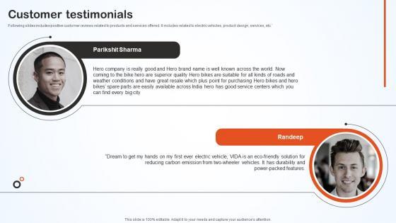Following slides includes positive customer reviews related to products and services offered. It includes related to electric vehicles, product design, services, etc. Find highly impressive Customer Testimonials Hero Bike Company Profile CP SS V on Slidegeeks to deliver a meaningful presentation. You can save an ample amount of time using these presentation templates. No need to worry to prepare everything from scratch because Slidegeeks experts have already done a huge research and work for you. You need to download Customer Testimonials Hero Bike Company Profile CP SS V for your upcoming presentation. All the presentation templates are 100 percent editable and you can change the color and personalize the content accordingly. Download now Following slides includes positive customer reviews related to products and services offered. It includes related to electric vehicles, product design, services, etc.