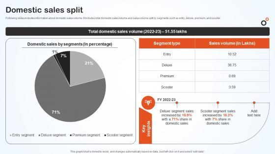 Following slides includes information about domestic sales volume. It includes total domestic sales volume and sales volume split by segments such as entry, deluxe, premium, and scooter. If your project calls for a presentation, then Slidegeeks is your go-to partner because we have professionally designed, easy-to-edit templates that are perfect for any presentation. After downloading, you can easily edit Domestic Sales Split Hero Bike Company Profile CP SS V and make the changes accordingly. You can rearrange slides or fill them with different images. Check out all the handy templates Following slides includes information about domestic sales volume. It includes total domestic sales volume and sales volume split by segments such as entry, deluxe, premium, and scooter.