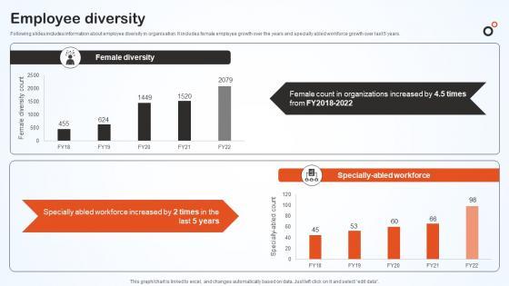 Following slides includes information about employee diversity in organisation. It includes female employee growth over the years and specially abled workforce growth over last 5 years. Are you in need of a template that can accommodate all of your creative concepts This one is crafted professionally and can be altered to fit any style. Use it with Google Slides or PowerPoint. Include striking photographs, symbols, depictions, and other visuals. Fill, move around, or remove text boxes as desired. Test out color palettes and font mixtures. Edit and save your work, or work with colleagues. Download Employee Diversity Hero Bike Company Profile CP SS V and observe how to make your presentation outstanding. Give an impeccable presentation to your group and make your presentation unforgettable. Following slides includes information about employee diversity in organisation. It includes female employee growth over the years and specially abled workforce growth over last 5 years.