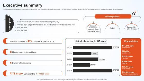 Following slides displays executive insights of Hero MotoCorp Company comprising description, CSR insights, key statistics, product portfolio, manufacturing units, business presence, and subsidiaries. Make sure to capture your audiences attention in your business displays with our gratis customizable Executive Summary Hero Bike Company Profile CP SS V. These are great for business strategies, office conferences, capital raising or task suggestions. If you desire to acquire more customers for your tech business and ensure they stay satisfied, create your own sales presentation with these plain slides. Following slides displays executive insights of Hero MotoCorp Company comprising description, CSR insights, key statistics, product portfolio, manufacturing units, business presence, and subsidiaries.