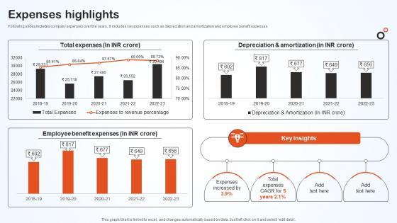 Following slides includes company expenses over the years. It includes key expenses such as depreciation and amortization and employee benefit expenses. Formulating a presentation can take up a lot of effort and time, so the content and message should always be the primary focus. The visuals of the PowerPoint can enhance the presenters message, so our Expenses Highlights Hero Bike Company Profile CP SS V was created to help save time. Instead of worrying about the design, the presenter can concentrate on the message while our designers work on creating the ideal templates for whatever situation is needed. Slidegeeks has experts for everything from amazing designs to valuable content, we have put everything into Expenses Highlights Hero Bike Company Profile CP SS V. Following slides includes company expenses over the years. It includes key expenses such as depreciation and amortization and employee benefit expenses.