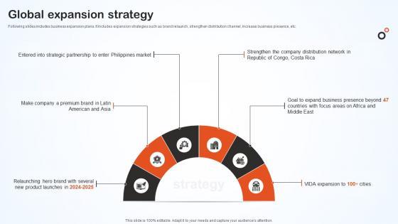 Following slides includes business expansion plans. It includes expansion strategies such as brand relaunch, strengthen distribution channel, increase business presence, etc. Coming up with a presentation necessitates that the majority of the effort goes into the content and the message you intend to convey. The visuals of a PowerPoint presentation can only be effective if it supplements and supports the story that is being told. Keeping this in mind our experts created Global Expansion Strategy Hero Bike Company Profile CP SS V to reduce the time that goes into designing the presentation. This way, you can concentrate on the message while our designers take care of providing you with the right template for the situation. Following slides includes business expansion plans. It includes expansion strategies such as brand relaunch, strengthen distribution channel, increase business presence, etc.