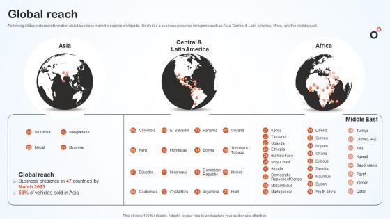 Following slides includes information about business market presence worldwide. It includes a business presence in regions such as Asia, Central and Latin America, Africa, and the middle east. This modern and well-arranged Global Reach Hero Bike Company Profile CP SS V provides lots of creative possibilities. It is very simple to customize and edit with the Powerpoint Software. Just drag and drop your pictures into the shapes. All facets of this template can be edited with Powerpoint, no extra software is necessary. Add your own material, put your images in the places assigned for them, adjust the colors, and then you can show your slides to the world, with an animated slide included. Following slides includes information about business market presence worldwide. It includes a business presence in regions such as Asia, Central and Latin America, Africa, and the middle east.