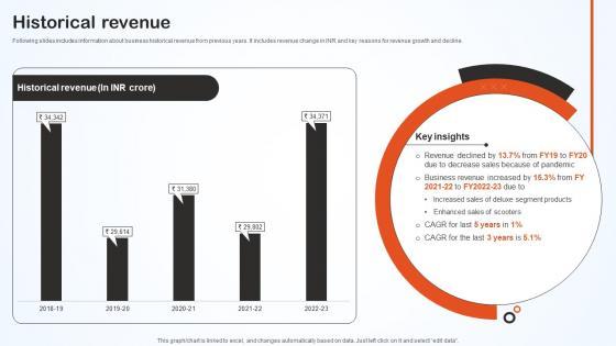 Following slides includes information about business historical revenue from previous years. It includes revenue change in INR and key reasons for revenue growth and decline. This Historical Revenue Hero Bike Company Profile CP SS V is perfect for any presentation, be it in front of clients or colleagues. It is a versatile and stylish solution for organizing your meetings. The Historical Revenue Hero Bike Company Profile CP SS V features a modern design for your presentation meetings. The adjustable and customizable slides provide unlimited possibilities for acing up your presentation. Slidegeeks has done all the homework before launching the product for you. So, do not wait, grab the presentation templates today Following slides includes information about business historical revenue from previous years. It includes revenue change in INR and key reasons for revenue growth and decline.