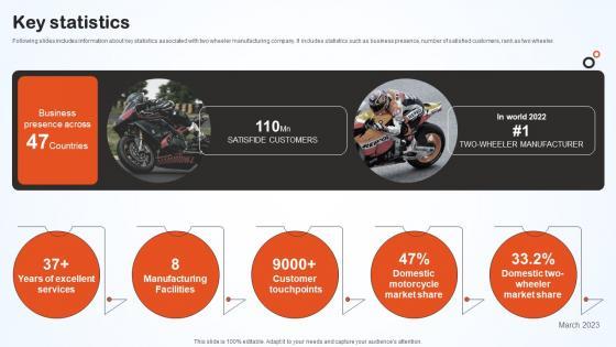 Following slides includes information about key statistics associated with two wheeler manufacturing company. It includes statistics such as business presence, number of satisfied customers, rank as two wheeler. Explore a selection of the finest Key Statistics Hero Bike Company Profile CP SS V here. With a plethora of professionally designed and pre-made slide templates, you can quickly and easily find the right one for your upcoming presentation. You can use our Key Statistics Hero Bike Company Profile CP SS V to effectively convey your message to a wider audience. Slidegeeks has done a lot of research before preparing these presentation templates. The content can be personalized and the slides are highly editable. Grab templates today from Slidegeeks. Following slides includes information about key statistics associated with two wheeler manufacturing company. It includes statistics such as business presence, number of satisfied customers, rank as two wheeler.