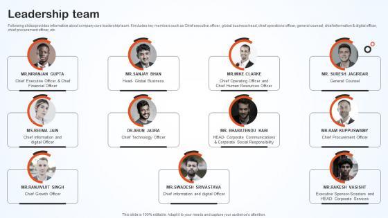 Following slides provides information about company core leadership team. It includes key members such as Chief executive officer, global business head, chief operations officer, general counsel, chief information and digital officer, chief procurement officer, etc. The best PPT templates are a great way to save time, energy, and resources. Slidegeeks have 100 percent editable powerpoint slides making them incredibly versatile. With these quality presentation templates, you can create a captivating and memorable presentation by combining visually appealing slides and effectively communicating your message. Download Leadership Team Hero Bike Company Profile CP SS V from Slidegeeks and deliver a wonderful presentation. Following slides provides information about company core leadership team. It includes key members such as Chief executive officer, global business head, chief operations officer, general counsel, chief information and digital officer, chief procurement officer, etc.