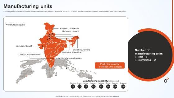 Following slides includes information about business market presence worldwide. It includes business market presence and vehicle manufacturing units across the globe. The Manufacturing Units Hero Bike Company Profile CP SS V is a compilation of the most recent design trends as a series of slides. It is suitable for any subject or industry presentation, containing attractive visuals and photo spots for businesses to clearly express their messages. This template contains a variety of slides for the user to input data, such as structures to contrast two elements, bullet points, and slides for written information. Slidegeeks is prepared to create an impression. Following slides includes information about business market presence worldwide. It includes business market presence and vehicle manufacturing units across the globe.
