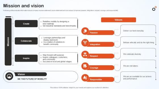 Following slides includes information about company mission statement, vision statement and core values comprises passion, integration, respect, courage, and responsibility. Retrieve professionally designed Mission And Vision Hero Bike Company Profile CP SS V to effectively convey your message and captivate your listeners. Save time by selecting pre-made slideshows that are appropriate for various topics, from business to educational purposes. These themes come in many different styles, from creative to corporate, and all of them are easily adjustable and can be edited quickly. Access them as PowerPoint templates or as Google Slides themes. You do not have to go on a hunt for the perfect presentation because Slidegeeks got you covered from everywhere. Following slides includes information about company mission statement, vision statement and core values comprises passion, integration, respect, courage, and responsibility.
