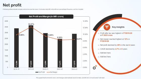 Following slides include company net income over the years. It includes net profit, net profit as a percentage of revenue, and key insights. Slidegeeks has constructed Net Profit Hero Bike Company Profile CP SS V after conducting extensive research and examination. These presentation templates are constantly being generated and modified based on user preferences and critiques from editors. Here, you will find the most attractive templates for a range of purposes while taking into account ratings and remarks from users regarding the content. This is an excellent jumping-off point to explore our content and will give new users an insight into our top-notch PowerPoint Templates. Following slides include company net income over the years. It includes net profit, net profit as a percentage of revenue, and key insights.