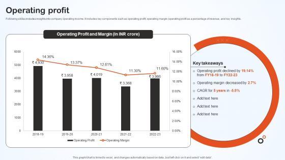 Following slides includes insights into company operating income. It includes key components such as operating profit, operating margin operating profit as a percentage of revenue, and key insights. Presenting this PowerPoint presentation, titled Operating Profit Hero Bike Company Profile CP SS V, with topics curated by our researchers after extensive research. This editable presentation is available for immediate download and provides attractive features when used. Download now and captivate your audience. Presenting this Operating Profit Hero Bike Company Profile CP SS V. Our researchers have carefully researched and created these slides with all aspects taken into consideration. This is a completely customizable Operating Profit Hero Bike Company Profile CP SS V that is available for immediate downloading. Download now and make an impact on your audience. Highlight the attractive features available with our PPTs. Following slides includes insights into company operating income. It includes key components such as operating profit, operating margin operating profit as a percentage of revenue, and key insights.
