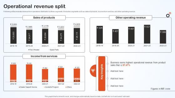 Following slides includes revenue from operations distribution by three segments. It includes segments such as sales of products, income from services, and other operating revenue. Here you can discover an assortment of the finest PowerPoint and Google Slides templates. With these templates, you can create presentations for a variety of purposes while simultaneously providing your audience with an eye-catching visual experience. Download Operational Revenue Split Hero Bike Company Profile CP SS V to deliver an impeccable presentation. These templates will make your job of preparing presentations much quicker, yet still, maintain a high level of quality. Slidegeeks has experienced researchers who prepare these templates and write high-quality content for you. Later on, you can personalize the content by editing the Operational Revenue Split Hero Bike Company Profile CP SS V. Following slides includes revenue from operations distribution by three segments. It includes segments such as sales of products, income from services, and other operating revenue.