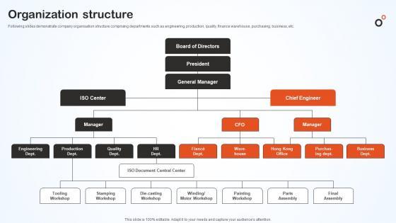 Following slides demonstrate company organisation structure comprising departments such as engineering, production, quality, finance warehouse, purchasing, business, etc. This Organization Structure Hero Bike Company Profile CP SS V from Slidegeeks makes it easy to present information on your topic with precision. It provides customization options, so you can make changes to the colors, design, graphics, or any other component to create a unique layout. It is also available for immediate download, so you can begin using it right away. Slidegeeks has done good research to ensure that you have everything you need to make your presentation stand out. Make a name out there for a brilliant performance. Following slides demonstrate company organisation structure comprising departments such as engineering, production, quality, finance warehouse, purchasing, business, etc.