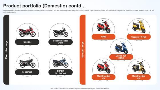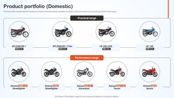 Following slides includes detailed overview of company domestic products segments. It includes motorcycle range such as practical and performance range. Find a pre-designed and impeccable Product Portfolio Domestic Hero Bike Company Profile CP SS V. The templates can ace your presentation without additional effort. You can download these easy-to-edit presentation templates to make your presentation stand out from others. So, what are you waiting for Download the template from Slidegeeks today and give a unique touch to your presentation. Following slides includes detailed overview of company domestic products segments. It includes motorcycle range such as practical and performance range.