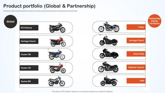 Following slides includes detailed overview of company global product range and partnership product range. Boost your pitch with our creative Product Portfolio Global And Partnership Hero Bike Company Profile CP SS V. Deliver an awe-inspiring pitch that will mesmerize everyone. Using these presentation templates you will surely catch everyones attention. You can browse the ppts collection on our website. We have researchers who are experts at creating the right content for the templates. So you do not have to invest time in any additional work. Just grab the template now and use them. Following slides includes detailed overview of company global product range and partnership product range.