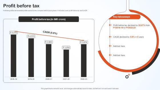 Following slides demonstrate profits earned by the company before paying taxes. It includes yearly profit before tax and CAGR. Create an editable Profit Before Tax Hero Bike Company Profile CP SS V that communicates your idea and engages your audience. Whether you are presenting a business or an educational presentation, pre-designed presentation templates help save time. Profit Before Tax Hero Bike Company Profile CP SS V is highly customizable and very easy to edit, covering many different styles from creative to business presentations. Slidegeeks has creative team members who have crafted amazing templates. So, go and get them without any delay. Following slides demonstrate profits earned by the company before paying taxes. It includes yearly profit before tax and CAGR.