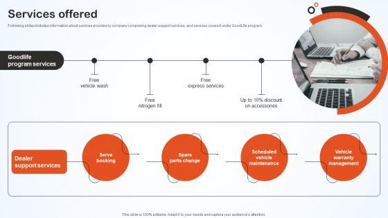 Following slides includes information about services provides by company comprising dealer support services, and services covered under GoodLife program. Want to ace your presentation in front of a live audience Our Services Offered Hero Bike Company Profile CP SS V can help you do that by engaging all the users towards you. Slidegeeks experts have put their efforts and expertise into creating these impeccable powerpoint presentations so that you can communicate your ideas clearly. Moreover, all the templates are customizable, and easy-to-edit and downloadable. Use these for both personal and commercial use. Following slides includes information about services provides by company comprising dealer support services, and services covered under GoodLife program.
