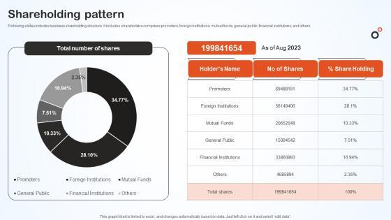 Following slides includes business shareholding structure. It includes shareholders comprises promoters, foreign institutions, mutual funds, general public, financial institutions, and others. There are so many reasons you need a Shareholding Pattern Hero Bike Company Profile CP SS V. The first reason is you can not spend time making everything from scratch, Thus, Slidegeeks has made presentation templates for you too. You can easily download these templates from our website easily. Following slides includes business shareholding structure. It includes shareholders comprises promoters, foreign institutions, mutual funds, general public, financial institutions, and others.