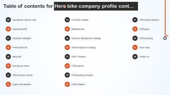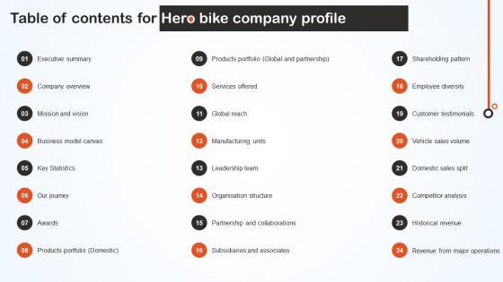 From laying roadmaps to briefing everything in detail, our templates are perfect for you. You can set the stage with your presentation slides. All you have to do is download these easy-to-edit and customizable templates. Table Of Contents For Hero Bike Company Profile CP SS V will help you deliver an outstanding performance that everyone would remember and praise you for. Do download this presentation today. Our Table Of Contents For Hero Bike Company Profile CP SS V are topically designed to provide an attractive backdrop to any subject. Use them to look like a presentation pro.