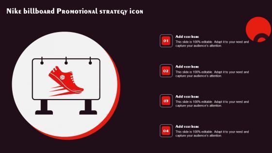Pitch your topic with ease and precision using this Nike Billboard Promotional Strategy Icon Infographics Pdf This layout presents information on Nike Billboard, Promotional Strategy Icon It is also available for immediate download and adjustment. So, changes can be made in the color, design, graphics or any other component to create a unique layout. Our Nike Billboard Promotional Strategy Icon Infographics Pdf are topically designed to provide an attractive backdrop to any subject. Use them to look like a presentation pro.