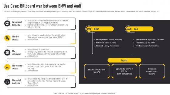 This slide provides glimpse about case study of ambush marketing started by Audi involving BMW with billboard advertising. It includes inception of the battle, the first attack, the retaliation, the end of the battle, impact, etc. This modern and well arranged Ambush Marketing Plan To Create Brand Awareness Use Case Billboard War Between Bmw And Audi Designs PDF provides lots of creative possibilities. It is very simple to customize and edit with the Powerpoint Software. Just drag and drop your pictures into the shapes. All facets of this template can be edited with Powerpoint no extra software is necessary. Add your own material, put your images in the places assigned for them, adjust the colors, and then you can show your slides to the world, with an animated slide included.
