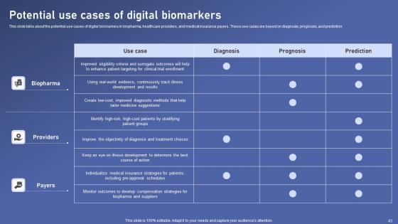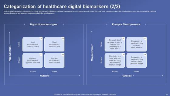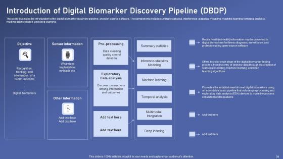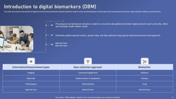 This slide describes the introduction to digital biomarkers that are transforming the healthcare system. It also includes the types of information and measurement used in this, data collection methods, and biomarkers. Presenting this PowerPoint presentation, titled Introduction Digital Biomarkers Biomedical Data Science And Health Informatics Diagrams Pdf, with topics curated by our researchers after extensive research. This editable presentation is available for immediate download and provides attractive features when used. Download now and captivate your audience. Presenting this Introduction Digital Biomarkers Biomedical Data Science And Health Informatics Diagrams Pdf. Our researchers have carefully researched and created these slides with all aspects taken into consideration. This is a completely customizable Introduction Digital Biomarkers Biomedical Data Science And Health Informatics Diagrams Pdf that is available for immediate downloading. Download now and make an impact on your audience. Highlight the attractive features available with our PPTs. This slide describes the introduction to digital biomarkers that are transforming the healthcare system. It also includes the types of information and measurement used in this, data collection methods, and biomarkers.