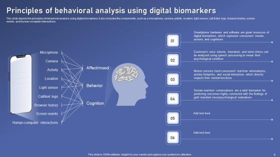 This slide depicts the principles of behavioral analysis using digital biomarkers. It also includes the components, such as a microphone, camera, activity, location, light sensor, call and text logs, browser history, screen events, and human computer interactions. There are so many reasons you need a Principles Of Behavioral Analysis Biomedical Data Science And Health Informatics Mockup Pdf. The first reason is you can not spend time making everything from scratch, Thus, Slidegeeks has made presentation templates for you too. You can easily download these templates from our website easily. This slide depicts the principles of behavioral analysis using digital biomarkers. It also includes the components, such as a microphone, camera, activity, location, light sensor, call and text logs, browser history, screen events, and human computer interactions.