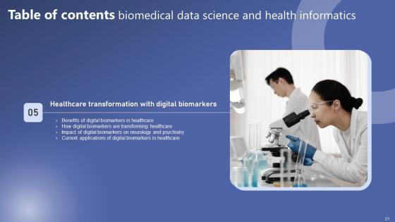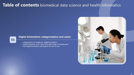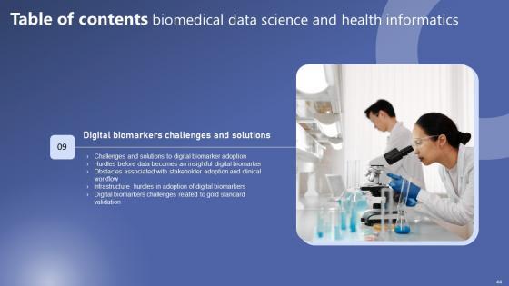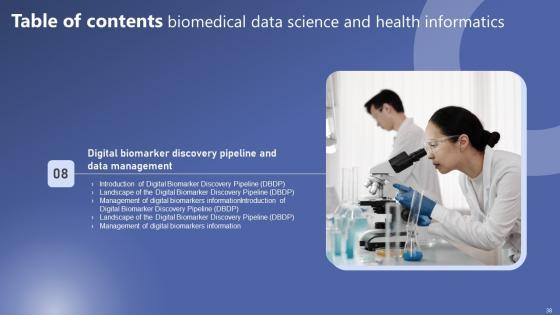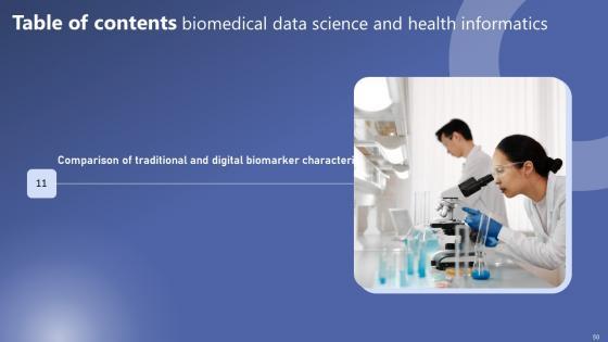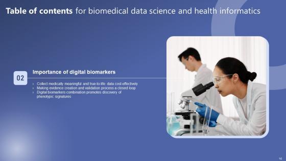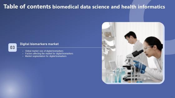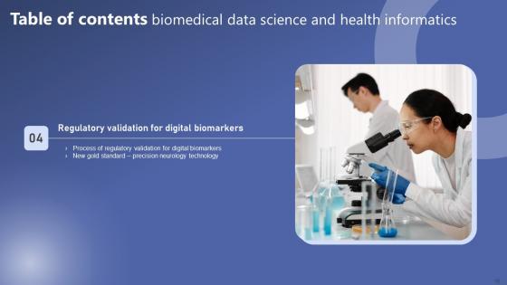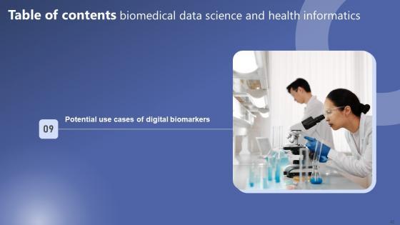 Do you have an important presentation coming up Are you looking for something that will make your presentation stand out from the rest Look no further than Biomedical Data Science And Health Informatics Table Of Contents Topics Pdf. With our professional designs, you can trust that your presentation will pop and make delivering it a smooth process. And with Slidegeeks, you can trust that your presentation will be unique and memorable. So why wait Grab Biomedical Data Science And Health Informatics Table Of Contents Topics Pdf today and make your presentation stand out from the rest Our Biomedical Data Science And Health Informatics Table Of Contents Topics Pdf are topically designed to provide an attractive backdrop to any subject. Use them to look like a presentation pro.