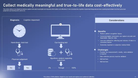 This slide outlines how digital biomarkers capture clinically meaningful and objective information cost effectively. It also includes the cognitive impairment diagnosis process covering hand drawn clock test, physician judgment, eye tracking rest, and so on. If you are looking for a format to display your unique thoughts, then the professionally designed Collect Medically Meaningful True biomedical Data Science And Health Informatics Brochure Pdf is the one for you. You can use it as a Google Slides template or a PowerPoint template. Incorporate impressive visuals, symbols, images, and other charts. Modify or reorganize the text boxes as you desire. Experiment with shade schemes and font pairings. Alter, share or cooperate with other people on your work. Download Collect Medically Meaningful True biomedical Data Science And Health Informatics Brochure Pdf and find out how to give a successful presentation. Present a perfect display to your team and make your presentation unforgettable. This slide outlines how digital biomarkers capture clinically meaningful and objective information cost effectively. It also includes the cognitive impairment diagnosis process covering hand drawn clock test, physician judgment, eye tracking rest, and so on.