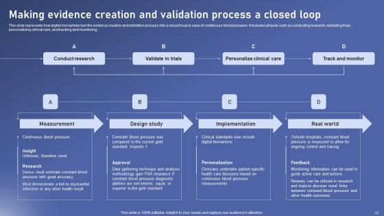 This slide represents how digital biomarkers turn the evidence creation and validation process into a closed loop in case of continuous blood pressure. It includes phases such as conducting research, validating trials, personalizing clinical care, and tracking and monitoring. Take your projects to the next level with our ultimate collection of Making Evidence Creation Biomedical Data Science And Health Informatics Professional Pdf. Slidegeeks has designed a range of layouts that are perfect for representing task or activity duration, keeping track of all your deadlines at a glance. Tailor these designs to your exact needs and give them a truly corporate look with your own brand colors they will make your projects stand out from the rest This slide represents how digital biomarkers turn the evidence creation and validation process into a closed loop in case of continuous blood pressure. It includes phases such as conducting research, validating trials, personalizing clinical care, and tracking and monitoring.