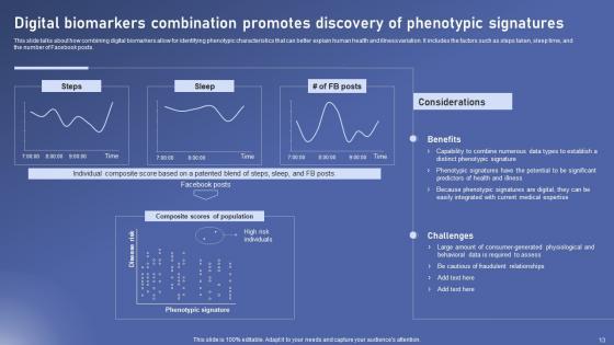 This slide talks about how combining digital biomarkers allow for identifying phenotypic characteristics that can better explain human health and illness variation. It includes the factors such as steps taken, sleep time, and the number of Facebook posts. This modern and well arranged Digital Biomarkers Combination Biomedical Data Science And Health Informatics Summary Pdf provides lots of creative possibilities. It is very simple to customize and edit with the Powerpoint Software. Just drag and drop your pictures into the shapes. All facets of this template can be edited with Powerpoint, no extra software is necessary. Add your own material, put your images in the places assigned for them, adjust the colors, and then you can show your slides to the world, with an animated slide included. This slide talks about how combining digital biomarkers allow for identifying phenotypic characteristics that can better explain human health and illness variation. It includes the factors such as steps taken, sleep time, and the number of Facebook posts.