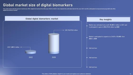 This slide represents the global market size of the digital biomarkers from the year 2022 to 2028. It also depicts the estimated rate for the year 2021 and the anticipated compound annual growth rate of the digital biomarkers market. The best PPT templates are a great way to save time, energy, and resources. Slidegeeks have 100 percent editable powerpoint slides making them incredibly versatile. With these quality presentation templates, you can create a captivating and memorable presentation by combining visually appealing slides and effectively communicating your message. Download Global Market Size Of Digital Biomedical Data Science And Health Informatics Microsoft Pdf from Slidegeeks and deliver a wonderful presentation. This slide represents the global market size of the digital biomarkers from the year 2022 to 2028. It also depicts the estimated rate for the year 2021 and the anticipated compound annual growth rate of the digital biomarkers market.