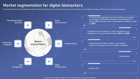 This slide outlines the market segmentation for digital biomarkers, including sleep and movement, cardiovascular, mood and behavior, pain management, respiratory conditions, and neurodegenerative disorders. Find a pre designed and impeccable Market Segmentation Digital Biomedical Data Science And Health Informatics Mockup Pdf. The templates can ace your presentation without additional effort. You can download these easy to edit presentation templates to make your presentation stand out from others. So, what are you waiting for Download the template from Slidegeeks today and give a unique touch to your presentation. This slide outlines the market segmentation for digital biomarkers, including sleep and movement, cardiovascular, mood and behavior, pain management, respiratory conditions, and neurodegenerative disorders.