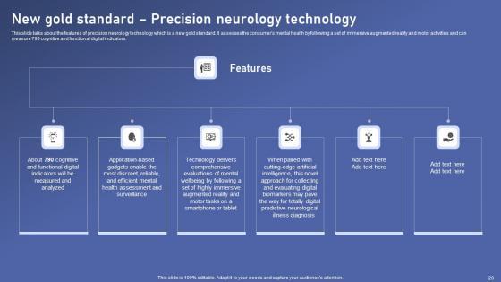 This slide talks about the features of precision neurology technology which is a new gold standard. It assesses the consumers mental health by following a set of immersive augmented reality and motor activities and can measure 790 cognitive and functional digital indicators. Boost your pitch with our creative New Gold Standard Precision Biomedical Data Science And Health Informatics Microsoft Pdf. Deliver an awe inspiring pitch that will mesmerize everyone. Using these presentation templates you will surely catch everyones attention. You can browse the ppts collection on our website. We have researchers who are experts at creating the right content for the templates. So you do not have to invest time in any additional work. Just grab the template now and use them. This slide talks about the features of precision neurology technology which is a new gold standard. It assesses the consumers mental health by following a set of immersive augmented reality and motor activities and can measure 790 cognitive and functional digital indicators.