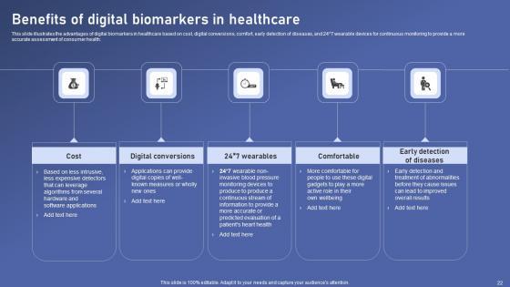 This slide illustrates the advantages of digital biomarkers in healthcare based on cost, digital conversions, comfort, early detection of diseases, and 24 7 wearable devices for continuous monitoring to provide a more accurate assessment of consumer health. From laying roadmaps to briefing everything in detail, our templates are perfect for you. You can set the stage with your presentation slides. All you have to do is download these easy to edit and customizable templates. Benefits Of Digital Biomarkers Biomedical Data Science And Health Informatics Diagrams Pdf will help you deliver an outstanding performance that everyone would remember and praise you for. Do download this presentation today. This slide illustrates the advantages of digital biomarkers in healthcare based on cost, digital conversions, comfort, early detection of diseases, and 24 7 wearable devices for continuous monitoring to provide a more accurate assessment of consumer health.
