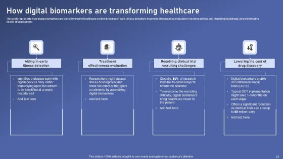 This slide represents how digital biomarkers are transforming the healthcare system by aiding in early illness detection, treatment effectiveness evaluation, resolving clinical trial recruiting challenges, and lowering the cost of drug discovery. Slidegeeks is here to make your presentations a breeze with Biomedical Data Science And Health Informatics How Digital Biomarkers Transforming Introduction Pdf With our easy to use and customizable templates, you can focus on delivering your ideas rather than worrying about formatting. With a variety of designs to choose from, you are sure to find one that suits your needs. And with animations and unique photos, illustrations, and fonts, you can make your presentation pop. So whether you are giving a sales pitch or presenting to the board, make sure to check out Slidegeeks first This slide represents how digital biomarkers are transforming the healthcare system by aiding in early illness detection, treatment effectiveness evaluation, resolving clinical trial recruiting challenges, and lowering the cost of drug discovery.