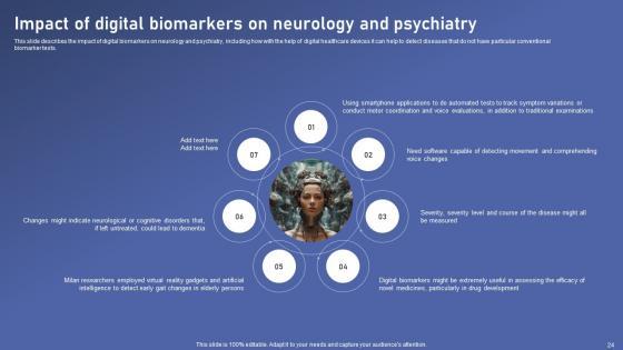 This slide describes the impact of digital biomarkers on neurology and psychiatry, including how with the help of digital healthcare devices it can help to detect diseases that do not have particular conventional biomarker tests. Retrieve professionally designed Impact Of Digital Biomarkers Biomedical Data Science And Health Informatics Slides Pdf to effectively convey your message and captivate your listeners. Save time by selecting pre made slideshows that are appropriate for various topics, from business to educational purposes. These themes come in many different styles, from creative to corporate, and all of them are easily adjustable and can be edited quickly. Access them as PowerPoint templates or as Google Slides themes. You do not have to go on a hunt for the perfect presentation because Slidegeeks got you covered from everywhere. This slide describes the impact of digital biomarkers on neurology and psychiatry, including how with the help of digital healthcare devices it can help to detect diseases that do not have particular conventional biomarker tests.