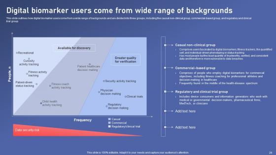 This slide outlines how digital biomarker users come from a wide range of backgrounds and are divided into three groups, including the causal non clinical group, commercial based group, and regulatory and clinical trial group. Formulating a presentation can take up a lot of effort and time, so the content and message should always be the primary focus. The visuals of the PowerPoint can enhance the presenters message, so our Digital Biomarker Users Wide Biomedical Data Science And Health Informatics Designs Pdf was created to help save time. Instead of worrying about the design, the presenter can concentrate on the message while our designers work on creating the ideal templates for whatever situation is needed. Slidegeeks has experts for everything from amazing designs to valuable content, we have put everything into Digital Biomarker Users Wide Biomedical Data Science And Health Informatics Designs Pdf This slide outlines how digital biomarker users come from a wide range of backgrounds and are divided into three groups, including the causal non clinical group, commercial based group, and regulatory and clinical trial group.