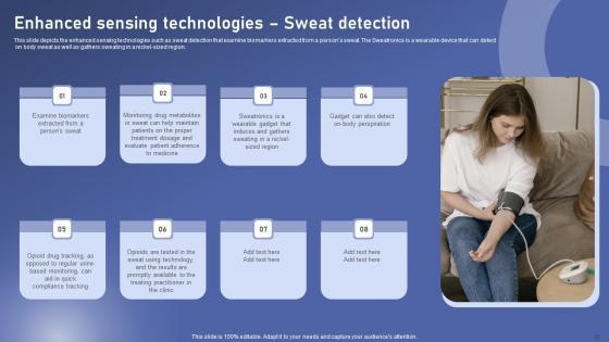 This slide depicts the enhanced sensing technologies such as sweat detection that examine biomarkers extracted from a persons sweat. The Sweatronics is a wearable device that can detect on body sweat as well as gathers sweating in a nickel sized region. Welcome to our selection of the Enhanced Sensing Technologies Sweat Biomedical Data Science And Health Informatics Icons Pdf. These are designed to help you showcase your creativity and bring your sphere to life. Planning and Innovation are essential for any business that is just starting out. This collection contains the designs that you need for your everyday presentations. All of our PowerPoints are 100 percent editable, so you can customize them to suit your needs. This multi purpose template can be used in various situations. Grab these presentation templates today This slide depicts the enhanced sensing technologies such as sweat detection that examine biomarkers extracted from a persons sweat. The Sweatronics is a wearable device that can detect on body sweat as well as gathers sweating in a nickel sized region.