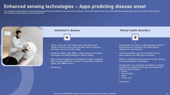 This slide talks about the advanced sensing technology apps for early predictions of diseases such as Alzheimers and mental health disorders. The mental health disorder apps offer analysis of behavioral health problems such as interest, social isolation, mood, and energy level. This Enhanced Sensing Technologies Biomedical Data Science And Health Informatics Introduction Pdf is perfect for any presentation, be it in front of clients or colleagues. It is a versatile and stylish solution for organizing your meetings. The Enhanced Sensing Technologies Biomedical Data Science And Health Informatics Introduction Pdf features a modern design for your presentation meetings. The adjustable and customizable slides provide unlimited possibilities for acing up your presentation. Slidegeeks has done all the homework before launching the product for you. So, do not wait, grab the presentation templates today This slide talks about the advanced sensing technology apps for early predictions of diseases such as Alzheimers and mental health disorders. The mental health disorder apps offer analysis of behavioral health problems such as interest, social isolation, mood, and energy level.