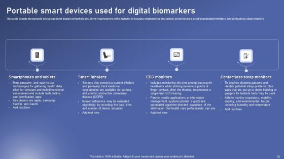 This slide depicts the portable devices used for digital biomarkers and some major players in the industry. It includes smartphones and tablets, smart inhalers, electrocardiogram monitors, and contactless sleep monitors. Slidegeeks is one of the best resources for PowerPoint templates. You can download easily and regulate Portable Smart Devices Used Biomedical Data Science And Health Informatics Microsoft Pdf for your personal presentations from our wonderful collection. A few clicks is all it takes to discover and get the most relevant and appropriate templates. Use our Templates to add a unique zing and appeal to your presentation and meetings. All the slides are easy to edit and you can use them even for advertisement purposes. This slide depicts the portable devices used for digital biomarkers and some major players in the industry. It includes smartphones and tablets, smart inhalers, electrocardiogram monitors, and contactless sleep monitors.