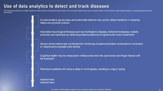This slide represents the use of data analytics to detect and track diseases through sensors, such as accelerometers, gyroscopes, and pedometers. These detectors easily identify variations in sleeping patterns and body movements. Whether you have daily or monthly meetings, a brilliant presentation is necessary. Use Of Data Analytics Detect Biomedical Data Science And Health Informatics Clipart Pdf can be your best option for delivering a presentation. Represent everything in detail using Use Of Data Analytics Detect Biomedical Data Science And Health Informatics Clipart Pdf and make yourself stand out in meetings. The template is versatile and follows a structure that will cater to your requirements. All the templates prepared by Slidegeeks are easy to download and edit. Our research experts have taken care of the corporate themes as well. So, give it a try and see the results. This slide represents the use of data analytics to detect and track diseases through sensors, such as accelerometers, gyroscopes, and pedometers. These detectors easily identify variations in sleeping patterns and body movements.