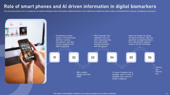 This slide represents the role of smartphones and artificial intelligence driven information in digital biomarkers. It also states how smartphones collect, analyze, and distribute from cameras, microphones, and sensors. From laying roadmaps to briefing everything in detail, our templates are perfect for you. You can set the stage with your presentation slides. All you have to do is download these easy to edit and customizable templates. Role Of Smart Phones Ai Driven Biomedical Data Science And Health Informatics Introduction Pdf will help you deliver an outstanding performance that everyone would remember and praise you for. Do download this presentation today. This slide represents the role of smartphones and artificial intelligence driven information in digital biomarkers. It also states how smartphones collect, analyze, and distribute from cameras, microphones, and sensors.