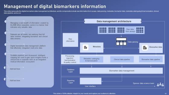 This slide represents the digital biomarkers data management architecture, and its components include raw information from assays, data parsing, metadata, biomarker data, metadata cataloguing and harmonization, clinical data pipeline, and so on. Do you know about Slidesgeeks Management Digital Biomarkers Biomedical Data Science And Health Informatics Themes Pdf These are perfect for delivering any kind od presentation. Using it, create PowerPoint presentations that communicate your ideas and engage audiences. Save time and effort by using our pre designed presentation templates that are perfect for a wide range of topic. Our vast selection of designs covers a range of styles, from creative to business, and are all highly customizable and easy to edit. Download as a PowerPoint template or use them as Google Slides themes. This slide represents the digital biomarkers data management architecture, and its components include raw information from assays, data parsing, metadata, biomarker data, metadata cataloguing and harmonization, clinical data pipeline, and so on.