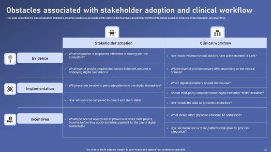 This slide describes the clinical adoption of digital biomarkers obstacles associated with stakeholder incentives and clinical workflow integration based on evidence, implementation, and incentives. Create an editable Obstacles Associated Stakeholder Biomedical Data Science And Health Informatics Template Pdf that communicates your idea and engages your audience. Whether you are presenting a business or an educational presentation, pre designed presentation templates help save time. Obstacles Associated Stakeholder Biomedical Data Science And Health Informatics Template Pdf is highly customizable and very easy to edit, covering many different styles from creative to business presentations. Slidegeeks has creative team members who have crafted amazing templates. So, go and get them without any delay. This slide describes the clinical adoption of digital biomarkers obstacles associated with stakeholder incentives and clinical workflow integration based on evidence, implementation, and incentives.