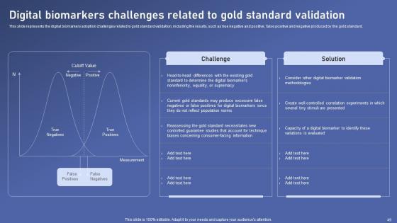 This slide represents the digital biomarkers adoption challenges related to gold standard validation, including the results, such as true negative and positive, false positive and negative produced by the gold standard. Coming up with a presentation necessitates that the majority of the effort goes into the content and the message you intend to convey. The visuals of a PowerPoint presentation can only be effective if it supplements and supports the story that is being told. Keeping this in mind our experts created Digital Biomarkers Challenges Biomedical Data Science And Health Informatics Professional Pdf to reduce the time that goes into designing the presentation. This way, you can concentrate on the message while our designers take care of providing you with the right template for the situation. This slide represents the digital biomarkers adoption challenges related to gold standard validation, including the results, such as true negative and positive, false positive and negative produced by the gold standard.