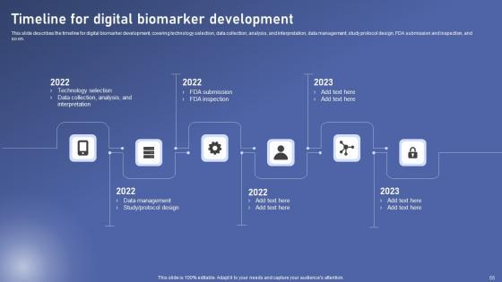 This slide describes the timeline for digital biomarker development, covering technology selection, data collection, analysis, and interpretation, data management, study protocol design, FDA submission and inspection, and so on. Do you have an important presentation coming up Are you looking for something that will make your presentation stand out from the rest Look no further than Timeline For Digital Biomarker Biomedical Data Science And Health Informatics Sample Pdf. With our professional designs, you can trust that your presentation will pop and make delivering it a smooth process. And with Slidegeeks, you can trust that your presentation will be unique and memorable. So why wait Grab Timeline For Digital Biomarker Biomedical Data Science And Health Informatics Sample Pdf today and make your presentation stand out from the rest This slide describes the timeline for digital biomarker development, covering technology selection, data collection, analysis, and interpretation, data management, study protocol design, FDA submission and inspection, and so on.
