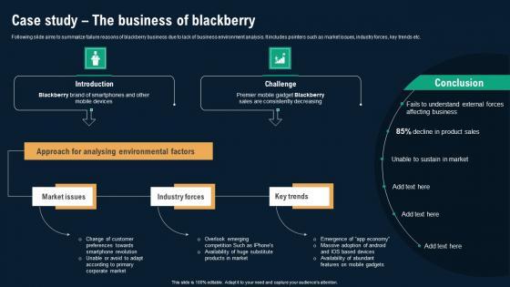 Following slide aims to summarize failure reasons of blackberry business due to lack of business environment analysis. It includes pointers such as market issues, industry forces, key trends etc. Are you in need of a template that can accommodate all of your creative concepts This one is crafted professionally and can be altered to fit any style. Use it with Google Slides or PowerPoint. Include striking photographs, symbols, depictions, and other visuals. Fill, move around, or remove text boxes as desired. Test out color palettes and font mixtures. Edit and save your work, or work with colleagues. Download Case Study The Business Of Blackberry Portrait PDF and observe how to make your presentation outstanding. Give an impeccable presentation to your group and make your presentation unforgettable.