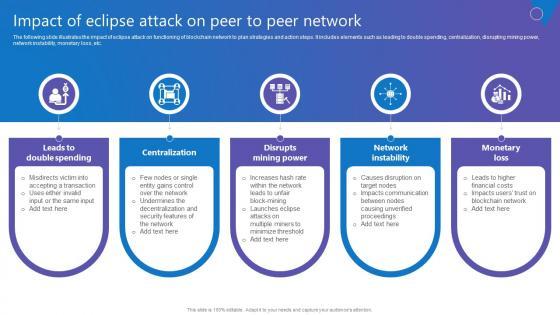 The following slide illustrates the impact of eclipse attack on functioning of blockchain network to plan strategies and action steps. It includes elements such as leading to double spending, centralization, disrupting mining power, network instability, monetary loss, etc. Do you have an important presentation coming up Are you looking for something that will make your presentation stand out from the rest Look no further than Impact Of Eclipse Attack Comprehensive Guide To Blockchain Digital Security Demonstration Pdf With our professional designs, you can trust that your presentation will pop and make delivering it a smooth process. And with Slidegeeks, you can trust that your presentation will be unique and memorable. So why wait Grab Impact Of Eclipse Attack Comprehensive Guide To Blockchain Digital Security Demonstration Pdf today and make your presentation stand out from the rest The following slide illustrates the impact of eclipse attack on functioning of blockchain network to plan strategies and action steps. It includes elements such as leading to double spending, centralization, disrupting mining power, network instability, monetary loss, etc.